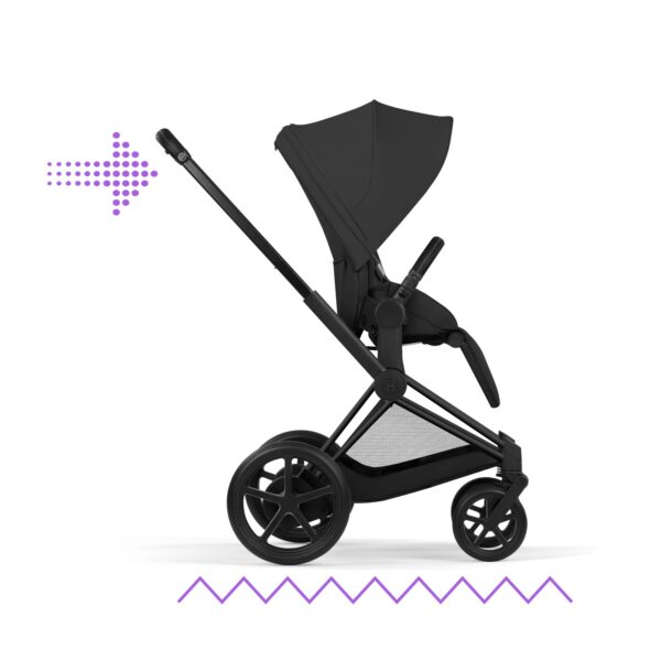 Till skillnad från traditionella barnvagnar ger E‑Priam dig eldriven assistans när du behöver den som mest. Tack vare Smart Hill Support får du extra kraft i uppförsbackar, vilket gör promenaderna både smidigare och mer avslappnade. Samtidigt anpassar sig vagnen automatiskt när du går på ojämna underlag, som kullersten, grusvägar eller sandiga strandpromenader. Därför kan du ta dig fram tryggt och bekvämt, även där andra barnvagnar får det tufft.